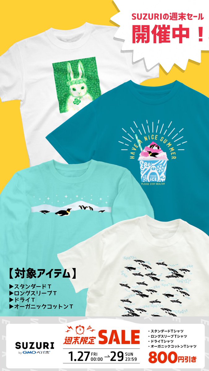 #SUZURI週末限定セール 始まりました! 1/29(日)23:59 までTシャツ4種が800円引きです。 ロンTも対象アイテムなので春先まではインナーに着ておくのも良いかも😌 宜しければコチラからご覧下さい▶︎ suzuri.jp/ThisIsMine0702… #SUZURI #ペンギン #ウサギ #イラスト #Tシャツ #ぺもの
