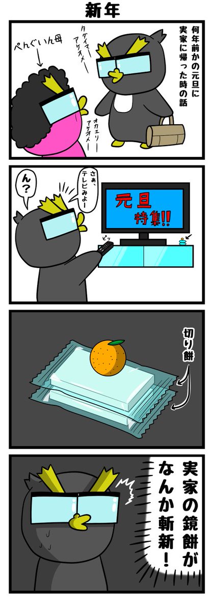 ぺんぐいん太郎 四コマ漫画「新年」 なんか凄い母親らしい… #ぺんぐいん太郎 #イラストレーター #ぺんぐいん太郎の日常 #イラスト #日常イラスト #四コマ漫画 #4コマ漫画 #漫画イラスト #新年 #鏡餅 #オリジナルキャラクター #イラスト好きな人と繋がりたい #絵描きさんと繋がりたい