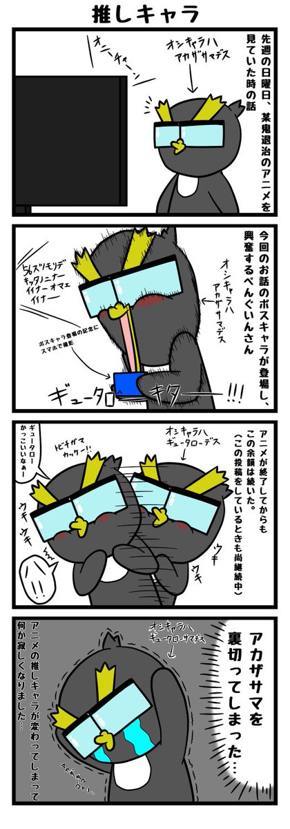 ぺんぐいん太郎 四コマ漫画「推しキャラ」 #ぺんぐいん太郎 #イラストレーター #ぺんぐいん太郎の日常 #イラスト #日常イラスト #四コマ漫画 #4コマ漫画 #漫画イラスト #推しキャラ #心変わり #なんか切ない #オリジナルキャラクター #イラスト好きな人と繋がりたい #絵描きさんと繋がりたい