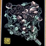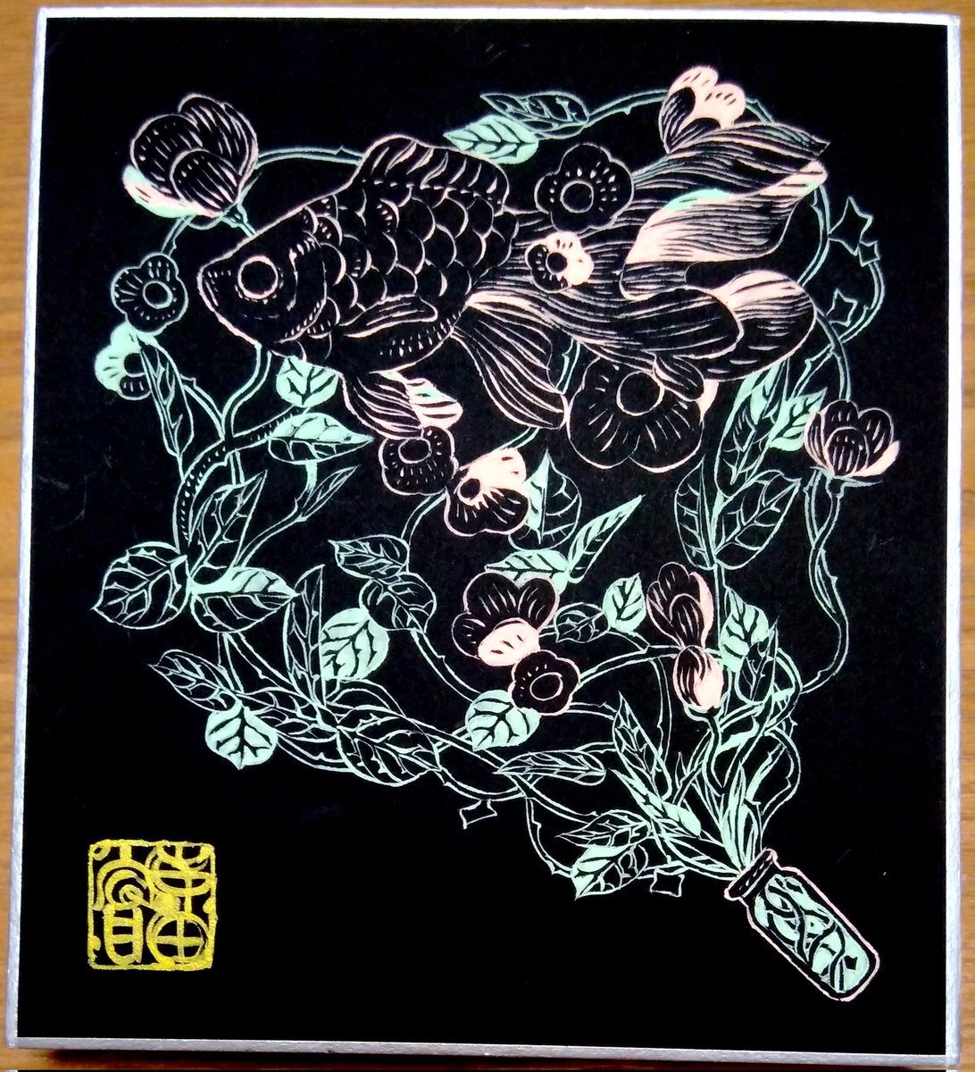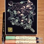 と言うわけで、#pentelday 2022のワークショップ用にいただいた #ミルキーブラッシュ 2色を使い、黒色紙(136mm ×121mm)に絵を描いてみた。マットな顔料インクの筆ペンで、ここまでスーッと描けるとは、その進化にビックリ感動。落款風のサインは #金の穂 で。 #ぺんてる #ぺんてる筆 #筆ペン
