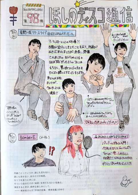 第98弾。歌、歌、そして特番ロケ。本当にお疲れ様でした‼️見所は多かったですが、特に筆者が好きなシーンを描きました。いかがですかね⁉️ #ほしのディスコ #パーパー #あいなぷぅ #星野一成 #ほしのディスコちゃんねる #ほぼ日手帳 #ほしのディスコ通信