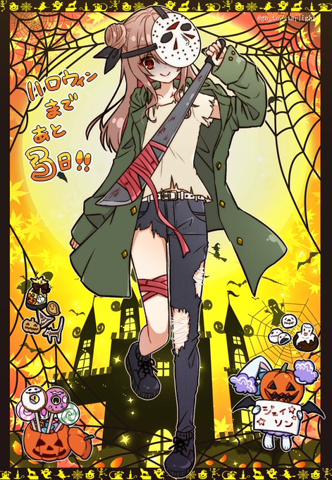 10.28 ハロウィンまであと3日!🎃 ジェイソンってチェーンソーのイメージだったけど、実は劇中で使ってるシーンはないらしい!マチェットが得意武器らしい!ヘェーッ ほなみんはどんな武器が得意かな……ドラム缶……? #ほなぁーと #ハロウィン2021