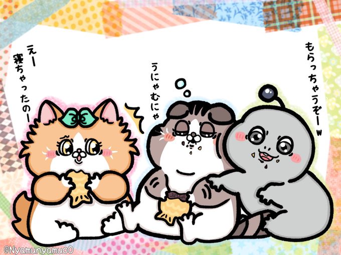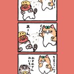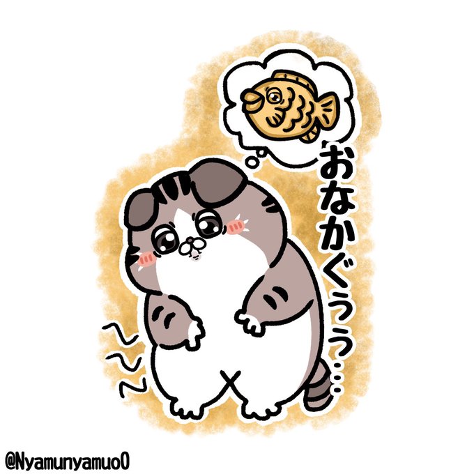 〚おやつの時間〛 大好物のたいやき✨ε( ε ˙³˙)з.。oO #猫 #イラスト #ゆるいイラスト #ほのぼのイラスト #ゆるかわ #みんなで楽しむTwitter展覧会 #アトリエの系譜S #イラスト好きな人と繋がりたい