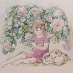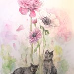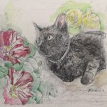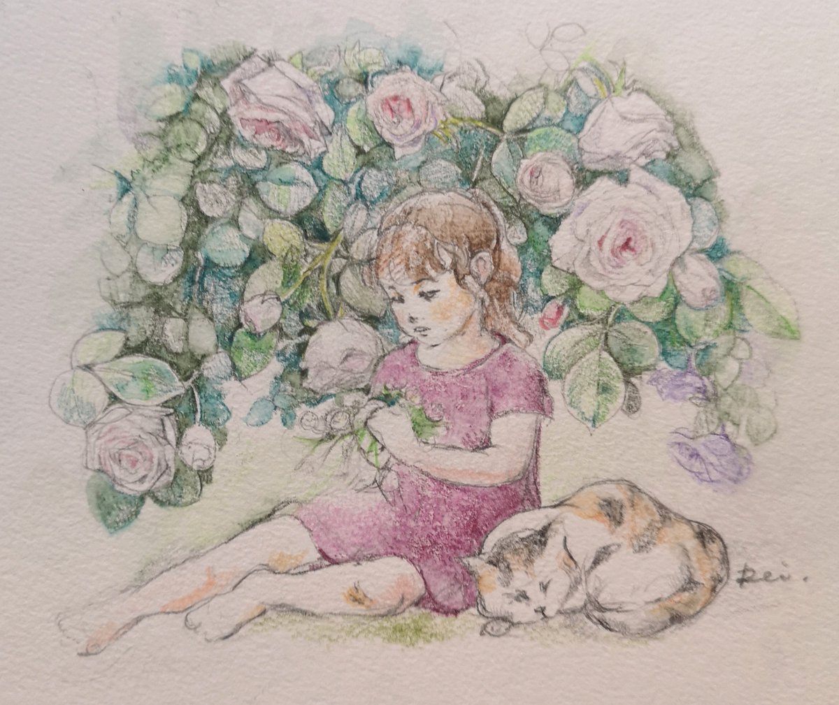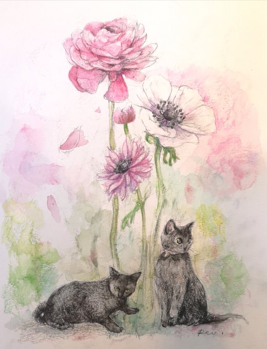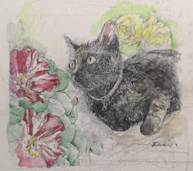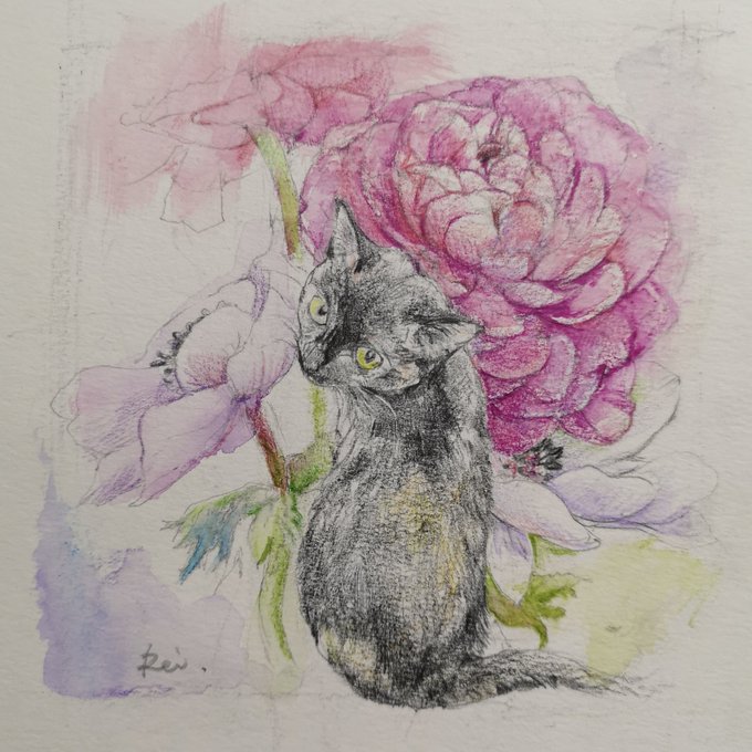 「早春」B5size 水彩色鉛筆/透明水彩/水彩紙(maruman vifart) #ほんじょうれいこ #猫 #猫好きさんと繫がりたい #絵画 #art #イラスト #illustraion #花