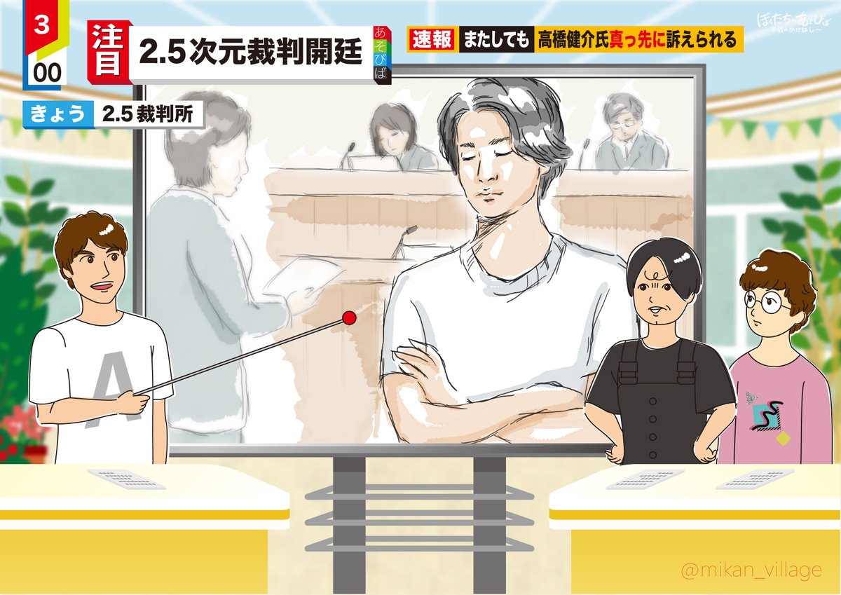 あそびば2.5次元裁判では、ほぼ毎回 最初に訴えられてしまう高橋健介氏。 新しいコーナーも次々生まれるけど、 末長く続いて欲しいこのシリーズ... #ぼくたちのあそびば ファンアート(法廷画&ワイドショー風)です。