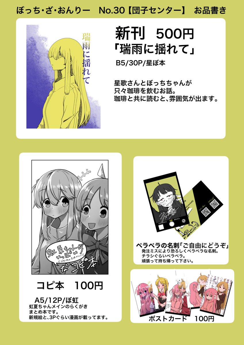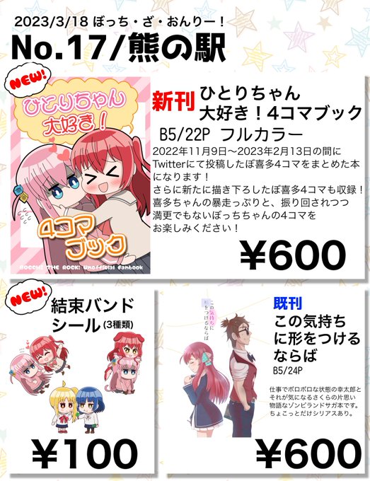 3/18(土)に綿商会館で行われる『ぼっち・ざ・おんりー! 』で出す、ぼ喜多本のサンプルです。 A5 20P 価格は500円 スペースは5FのNo.53です! メロンブックスさんで予約も始まってます!よろしくおねがいします! melonbooks.co.jp/detail/detail.… #ぼざおんりー