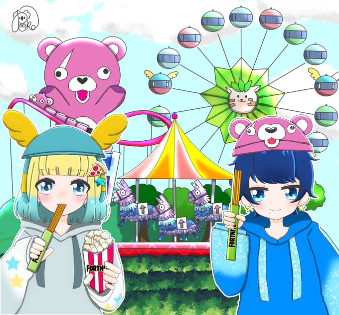 もしフォートナイトが テーマパークとコラボしたら…👀💭 お絵描きしてみた(*˙˘˙*) 背景もこだわったから時間かかった🤓 テーマパークでチュロスはかかせません 🎡🎠🎢 #フォートナイト #FortniteArt #お絵描き好きVTuber #Fortnite #お絵描き #ぽこ絵 #リツイート希望