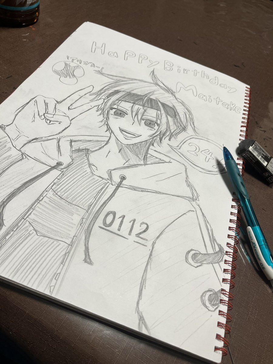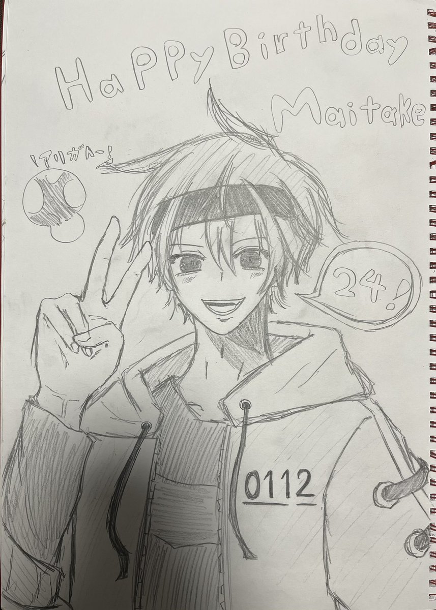 まいたけくんお誕生日おめでとうございます🎉🎂 ちょこらび、まいたけくんと出会って毎日が楽しい気持ちになっています!本当はデジタルで描きたかったけど私の画力では無理だったからアナログ色無しの絵を贈ります- ̗̀🎁 ̖́- #まいたけはぴば #まいたけ誕生祭2023 #まいたけ絵本