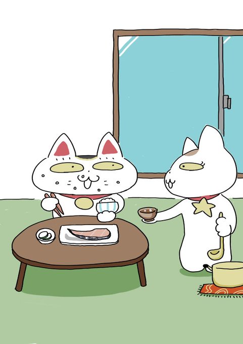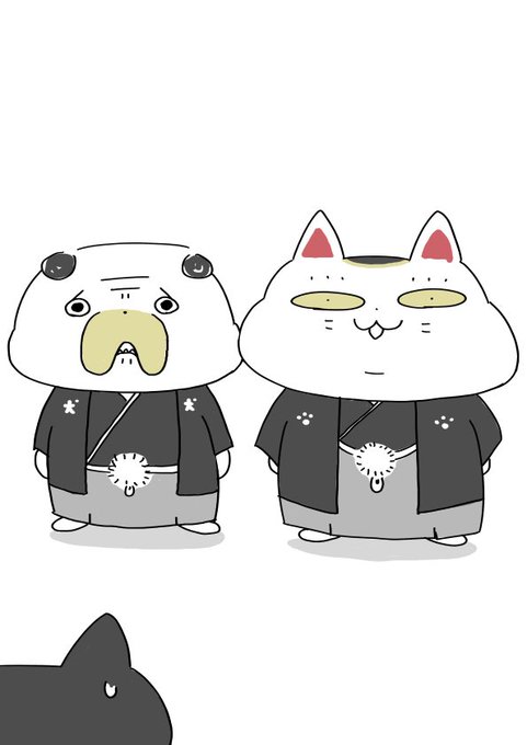 「あけましておめでとー」 「おーパグも来たにゃ」 「…ブルになっとるやん…、なんなの?初場所?」 #どこかの誰かに刺さればそれで良い #イラスト #猫 #ねこ #招き猫 #まねきねこ #まねきねこちゃあん
