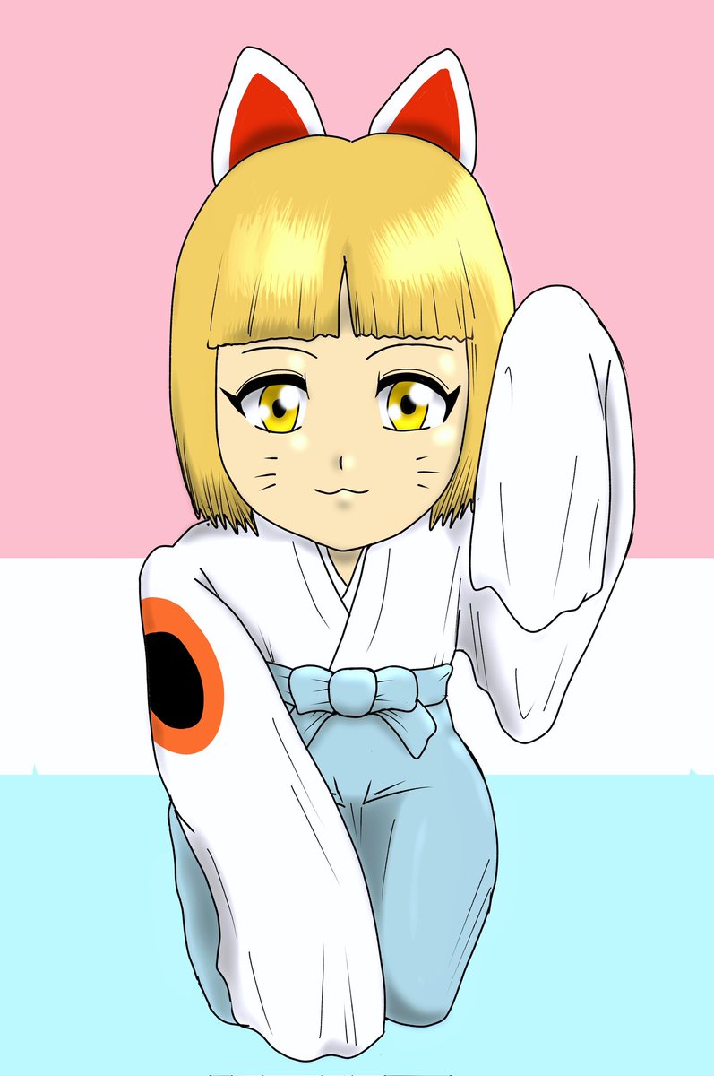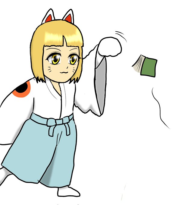 実は初めて描いた時は右のような姿で、より「豪徳寺ミケ」に似てた。 2回目の時にデザインを大幅変更。ただし左だけ猫手というのは残し着物の袖で普段は見えないように変えた。 #イラスト #まねきのくるりちゃん