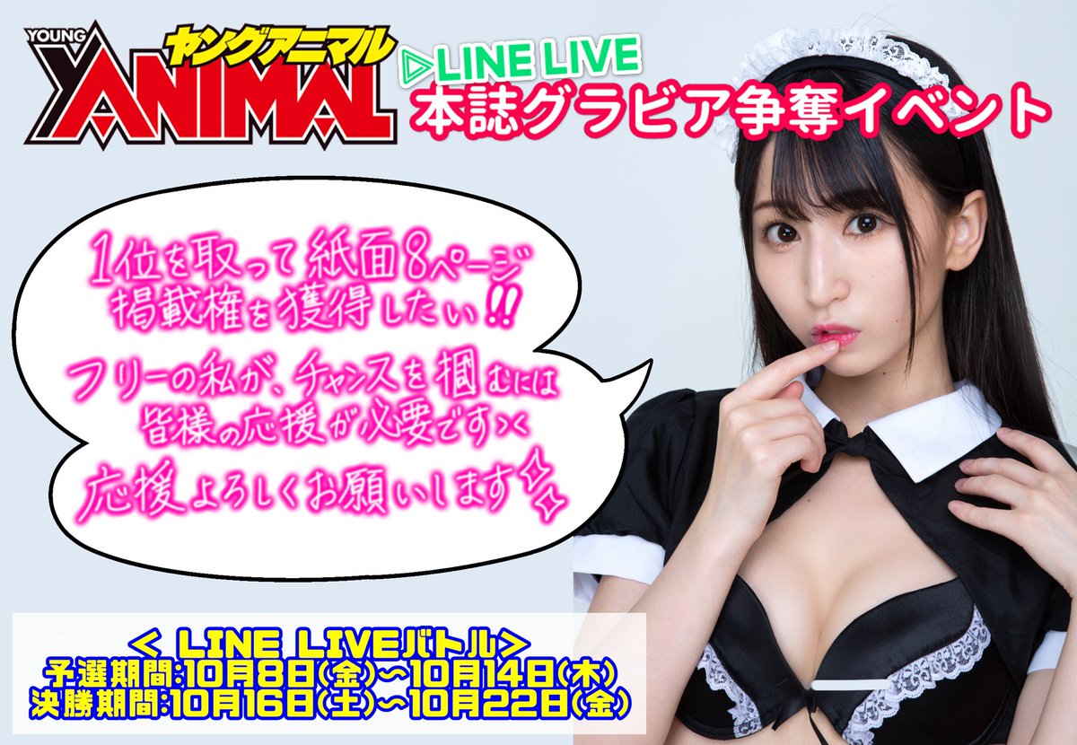 ★★★配信スタート★★★ 現在『ヤングアニマル紙面争奪戦』に参加中❣️ 配信でPTを投げたり、このツイートをRTしてください✨ 🏆LINELIVEチャンネル audition.younganimal.net/flow/ 🎬本日21:00~22:00頃予定(顔出し) 谷麻由里をフォロー・通知を許可にして待機お願いします🙇♀️💓 #まゆジュール