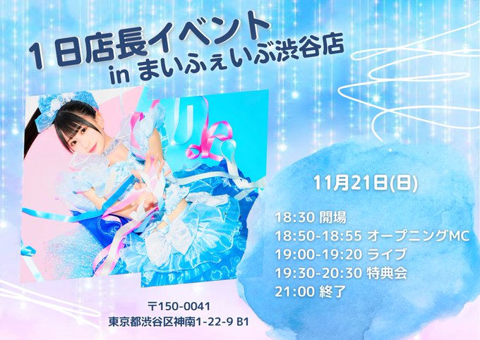 【✨お知らせ✨】 11/21(日) 1日店長イベント☕️ まいふぇいぶ渋谷店(@myfave_shibuya ) ♥ライブ有り🎤 ♥お店の制服着用👗 ♥pasela.co.jp/my-fave/ 18:30 開場 18:50-18:55 オープニングMC 19:00-19:20 ライブ 19:30-20:30 特典会 21:00 終了 カフェもライブも楽しんでね💓 #まゆジュール