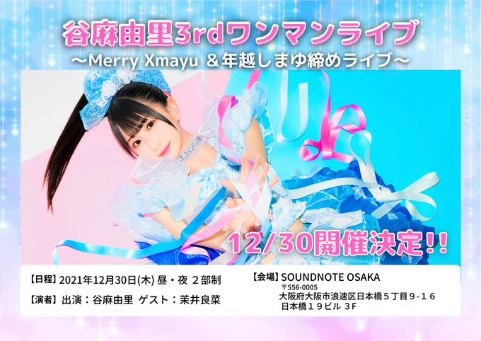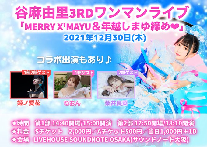 / 📣出演者追加❣️ 📣谷麻由里3rdワンマンライブ \ ⛳️12/30(木) SOUNDNOTE OSAKA 第1部 14:40開場/15:00開演 第2部 17:50開場/18:10開演 出演:谷麻由里/姫ノ愛花🆕/茉井良菜(2部)/ねおん(1部) Sチケ2000円 Aチケ500円 🎫 tiget.net/events/157260 ※予約受付中❣️ 最高の年末に✨ #まゆジュール