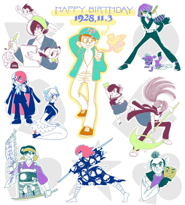 #手塚治虫生誕祭 #手塚治虫生誕祭2021 #まんがの日 大遅刻ですが、手塚治虫先生お誕生日おめでとうの絵。手塚先生、沢山の素晴らしき作品とキャラクター達をありがとうございます! 各キャラの衣装交換! キャラクターの選出は完全に趣味で衣装交換先はあみだくじ。