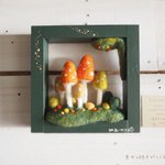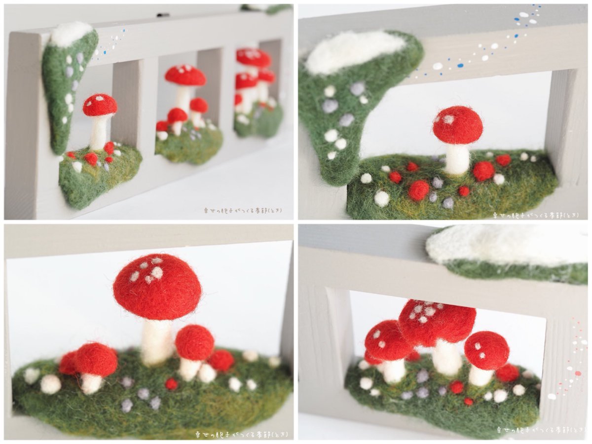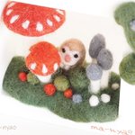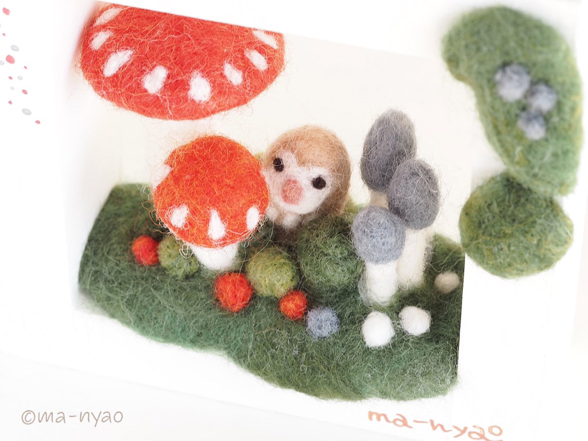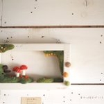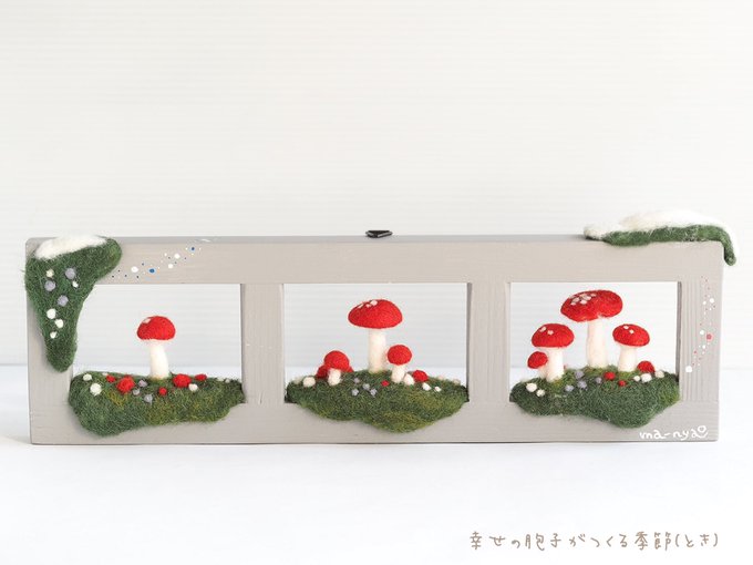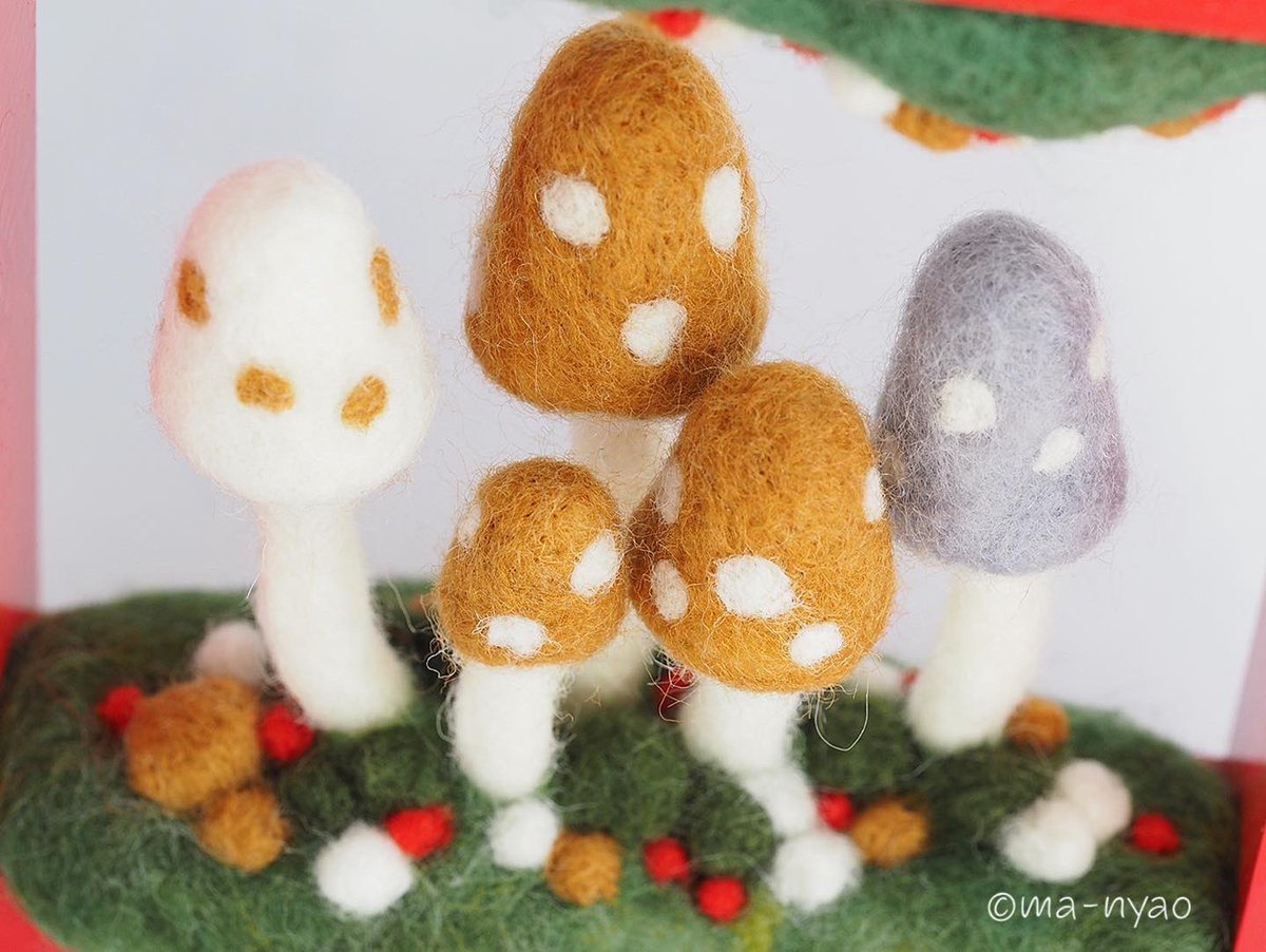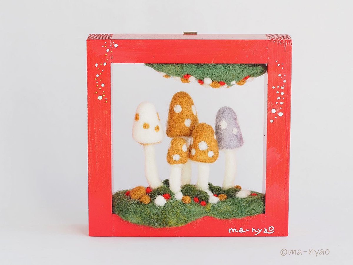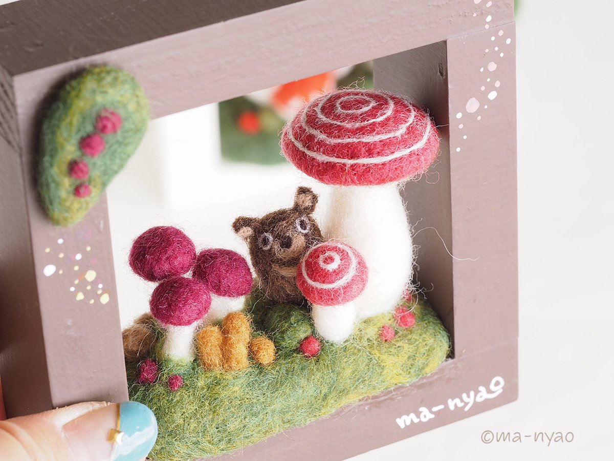 \ フレームにきのこ𖥣𖥣𖤥 / フレームのまどは7センチ四方。 それぞれの季節にあらわれる 森のなかまたちと… 幸せの胞子がつくる季節(とき)、 もうすぐです。 𖤘今週はじめにお引越し。 ただいまきのこづくりの場所を 確保するべく奮闘中ꕀ #羊毛フェルト #きのこ #まーにゃおroom