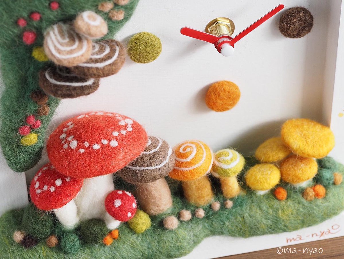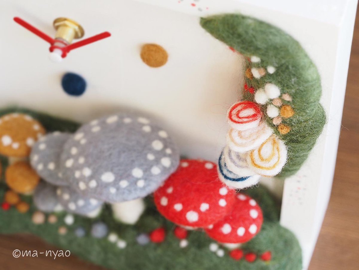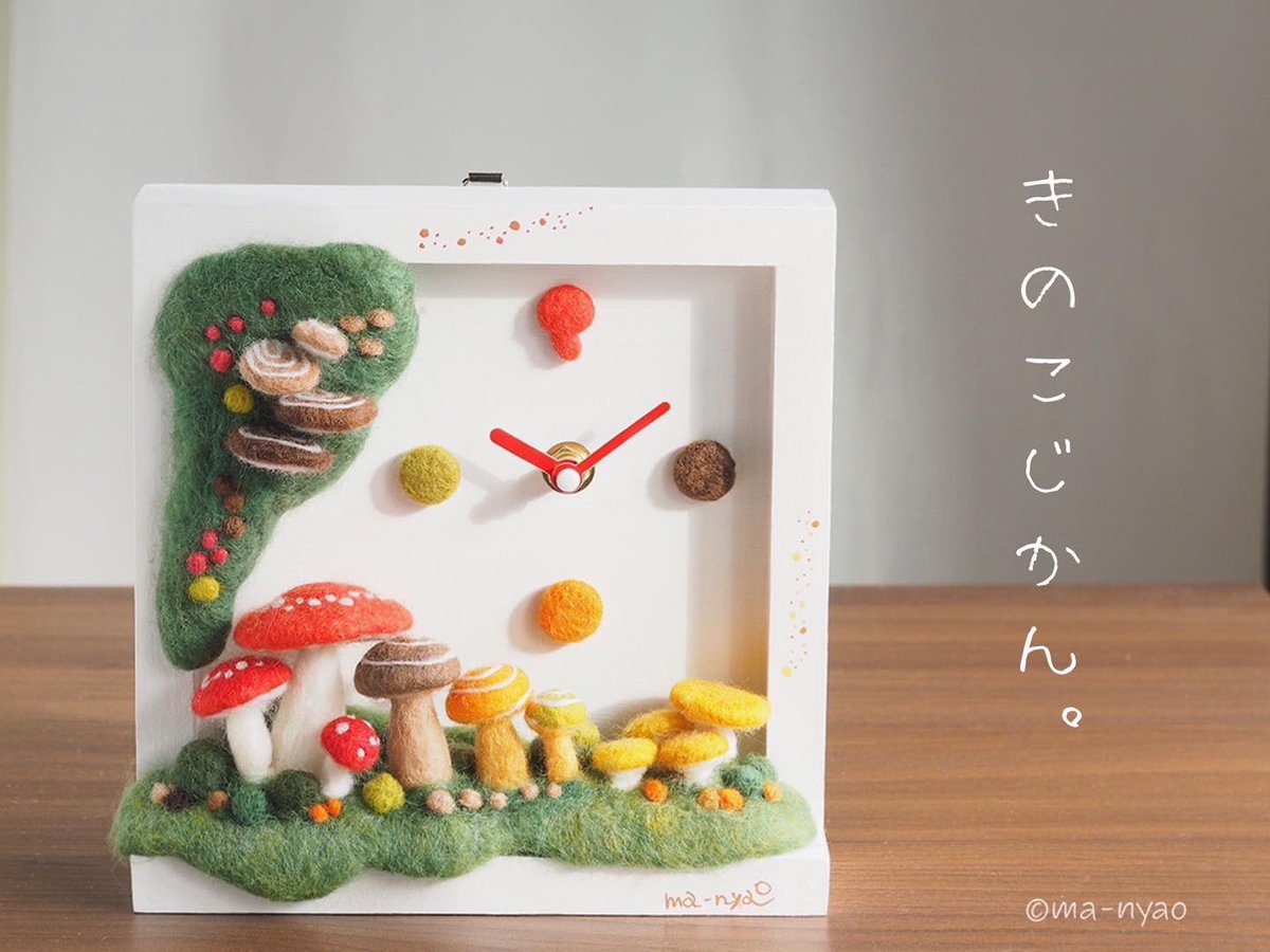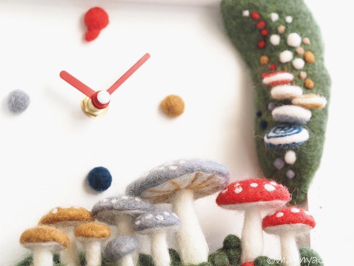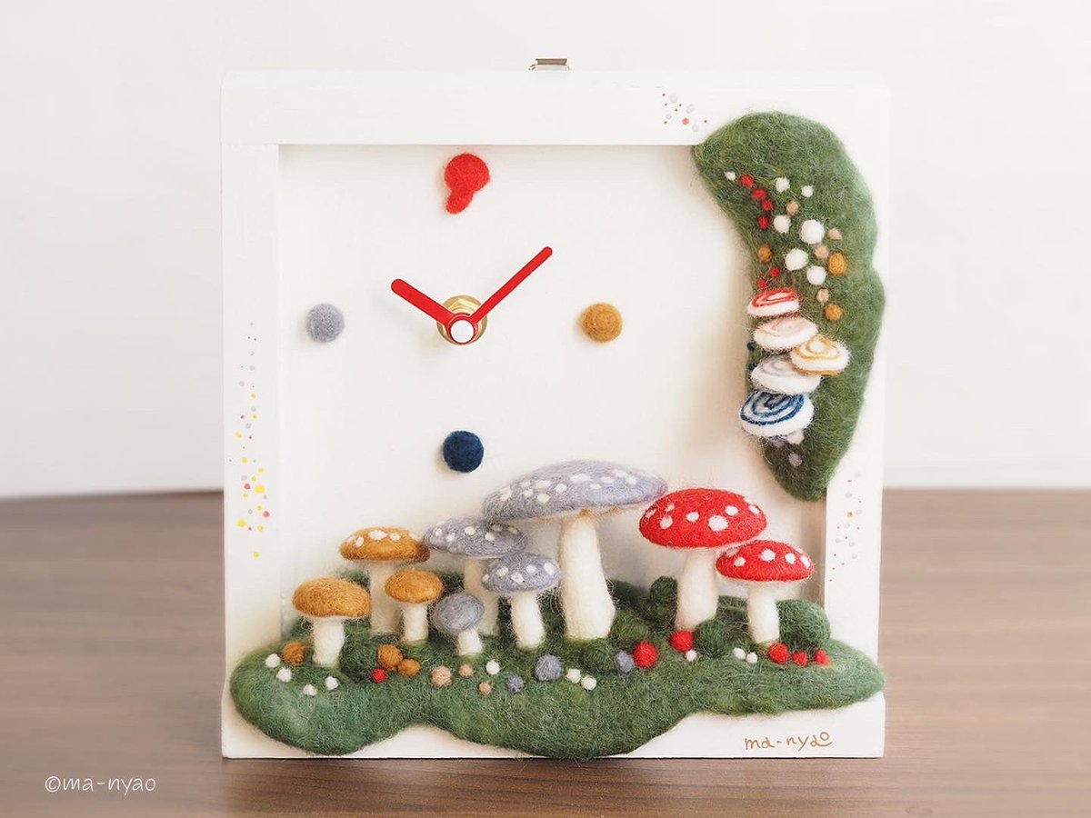 \ きのこじかん𖤣𖤣𖤣 / チクタクチクタク… いつもの時間を忘れて きのこじかんで、 のんびりしてみませんか? きのこの時計♪ ようやく完成しました。 置きも掛けもできます。 大変だったけど、 できあがりにニンマリ、です。 個展まであと3日…。 #羊毛フェルト #きのこ #まーにゃおroom