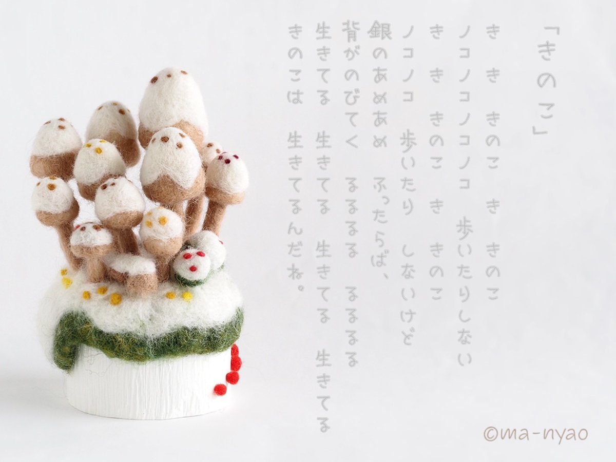 𖥣𖤣𖦥雪ふる冬、最終日𖤥𖥣𖥣 冬バージョン、そして個展の 最終日になりました。 いつもながらあっという間に 10日目がやってきます。 あと少し、私も皆さんと一緒に 楽しみたいと思います♪ 一度やってみたかった、 "下カラキノコ"シリーズの写真。 #羊毛フェルト #きのこ #まーにゃおroom