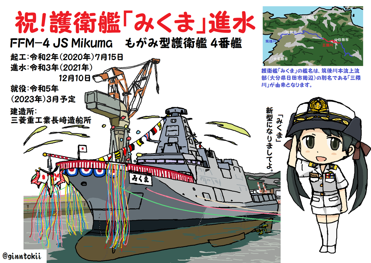 今日、12月10日は マレー沖海戦の日ですが twitter.com/ginntokii/stat… 護衛艦「#みくま」進水日でもあります 令和3年(2021年)12月10日 三菱重工業長崎造船所 もがみ型護衛艦 4番艦 艦名は筑後川上流の大分県日田市付近を流れる「三隈川」に由来 配属先も含め 就役後の活躍が楽しみです #海上自衛隊