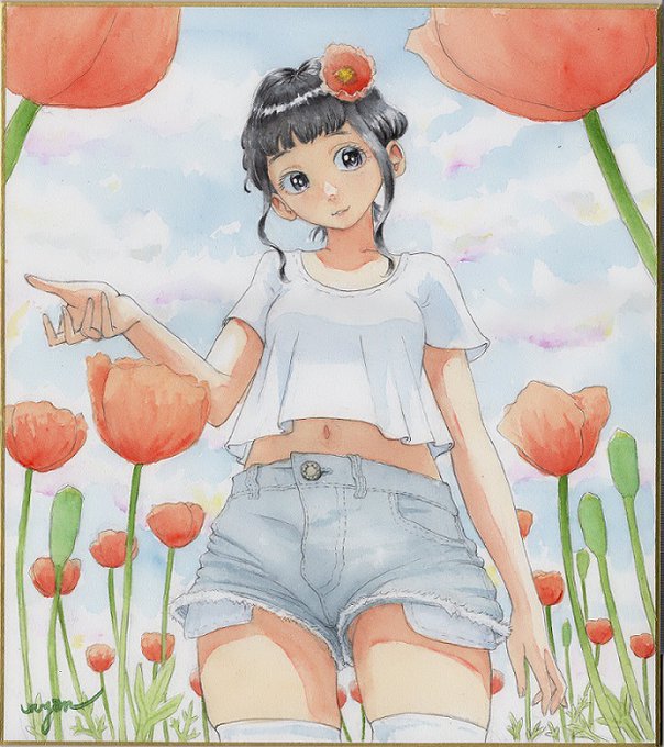 「ポピー」 田んぼ道を歩いてるとポピーが咲いていたので色紙に描いてみました。みちのくコミティア10仙台出張にて頒布予定の色紙です。 #オリジナルイラスト #ポピー #女の子 #色紙 #透明水彩 #watercolor #水彩画 #水彩イラスト #アナログイラスト #みちのくコミティア