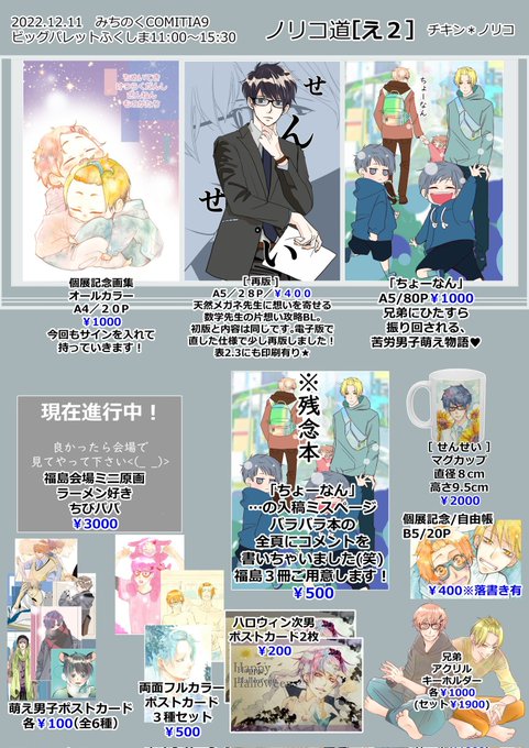 明日12/11開催の #みちのくコミティア のお品書きになります! スペNo.『え9/10』サークル『非科学少年』にてお待ちしております! サンプルなどは後ほどリプに繋げます! あともしかしたら開始30分程離席してるかもしれません #みちのくCOMITIA