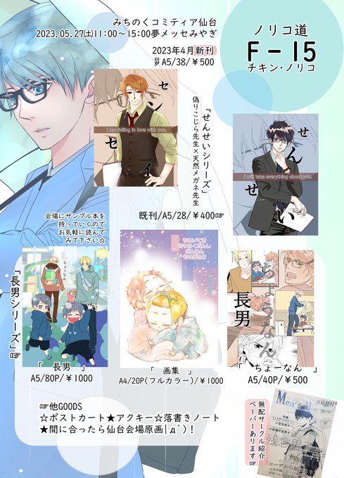 5/27(土) みちのくコミティア10(仙台)頒布物一覧です 【D15】鳩井レコーズ 新刊サンプルはツリーにて。 既刊のサンプルはこちら→ pixiv.net/artworks/77944… pixiv.net/artworks/68543… よろしくお願いします🎉 #みちのくCOMITIA #みちのくコミティア