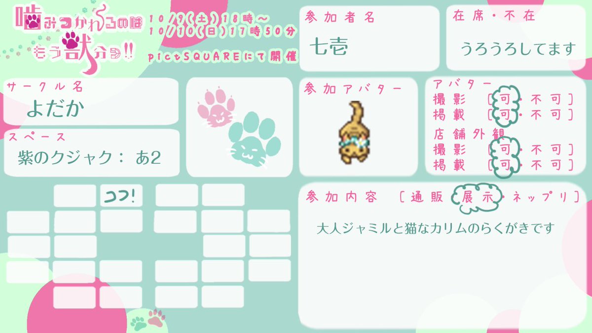 お知らせするほどのものではないのですが… 本日開催のみつかれに展示で参加します。 紫のクジャク: あ2 大人ジャミルと猫なカリムの落書きです 猫のアバターでうろうろしてます。見かけたらおしりに注目してください。 #みつかれ_1009