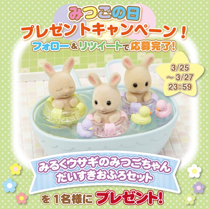 🎉みつごの日プレゼントキャンペーン🎉 この投稿をフォロー&RTしてくれた方の中から抽選で1名様に「みるくウサギのみつごちゃん だいすきおふろセット」をプレゼント✨ ①[@SylvanianJP]をフォロー ②この投稿をRT 3/27(日)23:59 〆切 #シルバニアファミリー #みつごの日