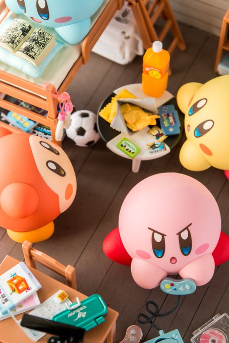 カービィちゃんルーム🎮🍹📖 各々好きなことをしてる。ワドちゃんは今来たところかな? 少し小物を足してるけど、今回のリーメント遊びがいありすぎる。男の子キャラがいるお家にはめちゃくちゃおすすめです💪うちは人外と女子ばっかだけど最高に遊べてます!!! #みやこわすれの玩具
