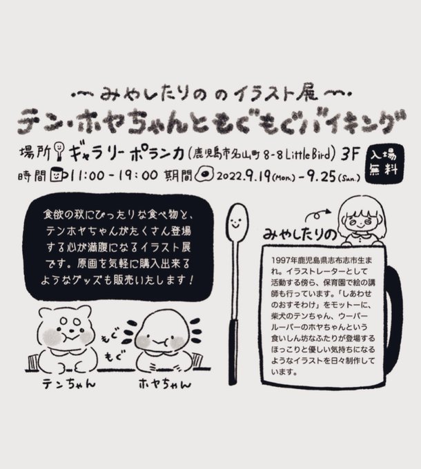 食欲の秋にぴったりな食べ物と、テンホヤちゃんがたくさん登場する"心が満腹になる"イラスト展です! 宜しくお願い致します🙇♀️ #食欲の秋 #食べ物イラスト #みやしたりののイラスト #イラスト #水彩画 #柴犬 #ウーパールーパー #レトロ #鹿児島 #シェアカゴ #kagoshima_art #絵描きさんと繋がりたい twitter.com/Sumomo27216/…