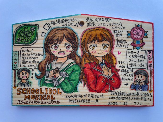 今日、兵庫県神戸市の生田神社にラブライブ絵馬を奉納しました。 東京.大阪公演と参加したスクミュ。鑑賞した内容を参考に椿ルリカ.滝沢アンズのW主人公と両校理事長を描きました。 絵馬で感謝を伝えます。最高の舞台劇でした!(・∀・) #lovelive #スクールアイドルミュージカル #みんなで叶えるSIM