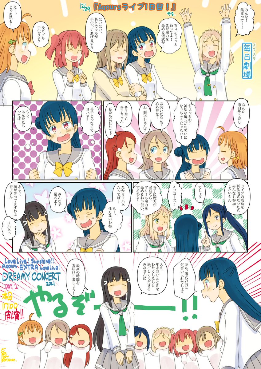 ようやく今日。久々の9人揃ったAqoursのライブですね!Aqours、ファンの皆様、本当に開催おめでとう✨✨ 自分は明日参加なので今日の配信はアーカイブで見ますが、成功を心から願っています! #みんなでAqours年末ライブ_Day1