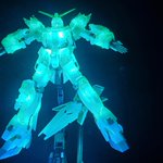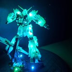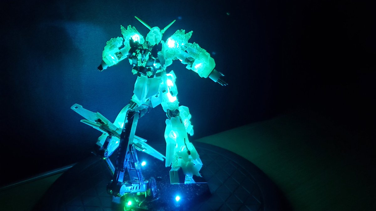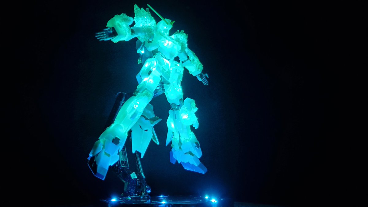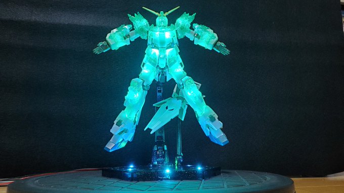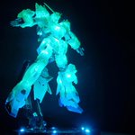 HGユニコーン光の結晶体 ledチップを30粒ほど使用、ホワイトだと白くなりすぎるのでアイスブルーにしたらいい感じ?(^^) 自己満足やー(*σ´ェ`)σタハッ HG大変やー #ガンプラ #ガンプラはどんな自由な発想で作ってもいいんだ #ガンプラの画像貼るとRTされると聞いて #みんなのユニコーンを見たい