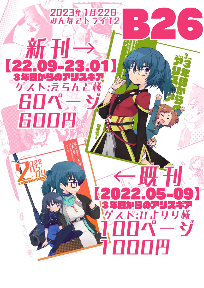 #みんなでトライ12 新刊入稿しました! 9月から今年1月ぐらいまでのまとめ本 60ページでお送りします! 今回はえらんと様にご助力いただきました。ありがたや…! 前回の本も持っていく他、もう少し出し物増えるかも、増えないかも。 #みんトラ #アリスギアお絵かき (日付修正のため再投稿しました)