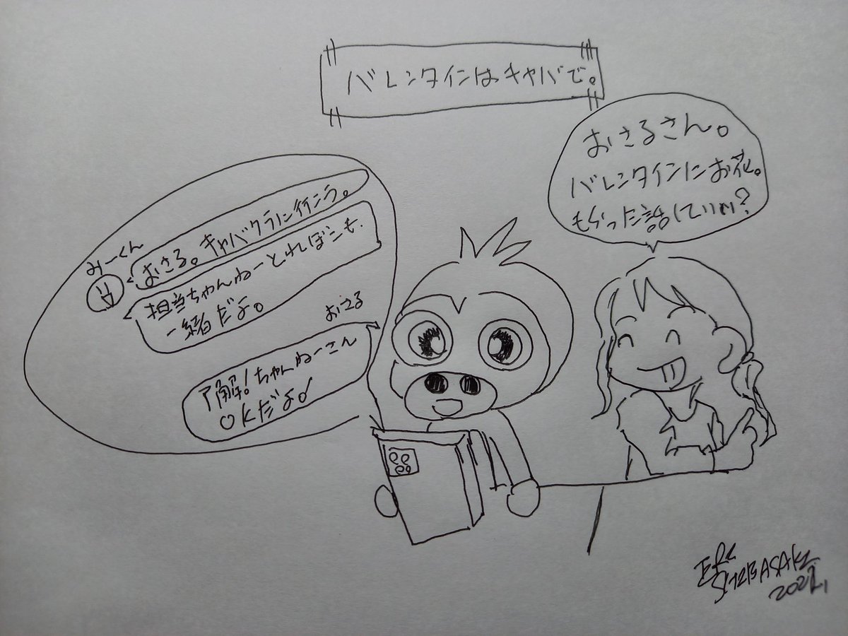 「バレンタインはキャバで。」 おさるさんのスマホに、みーくんから連絡が来る。 担当ちゃんねーと一緒に、待ち合わせのキャバクラに行ったら、バレンタインにお花をもらった事をいじり倒す。 #れぼこ #おさるさん #担当ちゃんねー #激務労働 #みーくん #絵描きさんと繋がりたい #絵師さんと繋がりたい