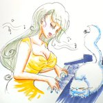 #オリキャライラスト #むぎしゃむのイラスト 猫のカカウェットはサラが苦手だけど、彼女の歌とピアノは気に入ってる #イラスト #絵描きさんと繋がりたい #illustration #創作の狼煙 #愛のシェヴ・ルゥ
