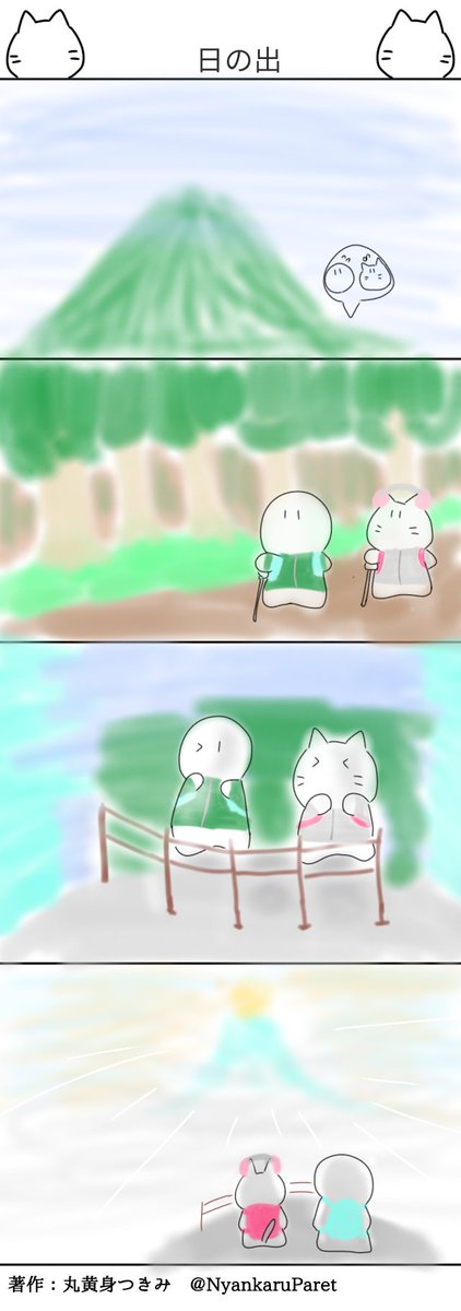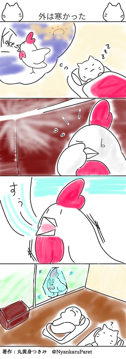 第46話 #むげんねこ 目覚ましにと外に出たニワトリさん。 思ったより空気が冷たくて・・? #4コマ漫画 #4framecartoon #漫画が読めるハッシュタグ #ねこ漫画 #朝の空気 #漫画好きな人とつながりたい
