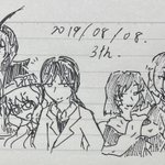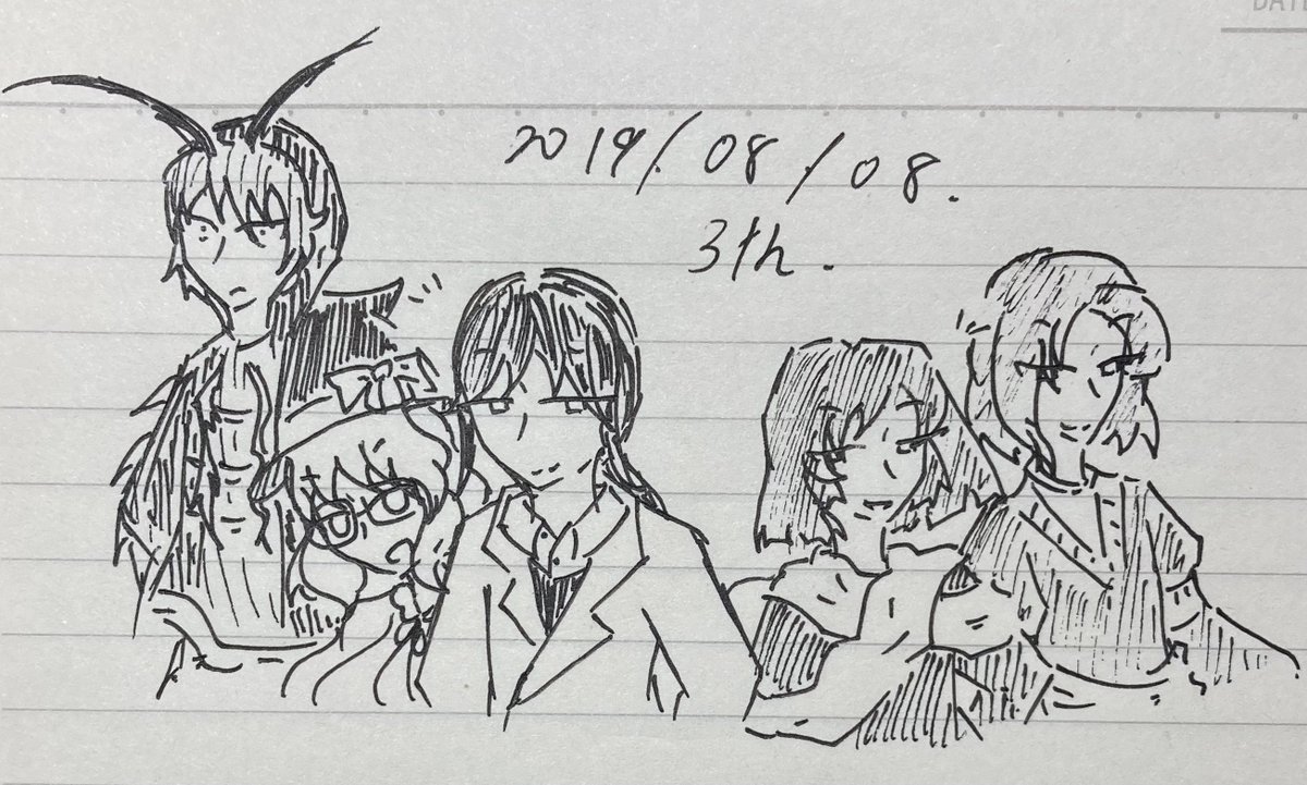 #むしのらくがきろく なんと一昨日(8/8)、異・シリーズを作り始めてから三年になったそうです。 Twitterに公開したのは2019年の12月でしたが、作り始めたのは2019年の8月なのです。 主人公二人を含めた五人のデジタル立ち絵がこの日に描かれたようなので、当時の絵柄風に五人を描いてみました。