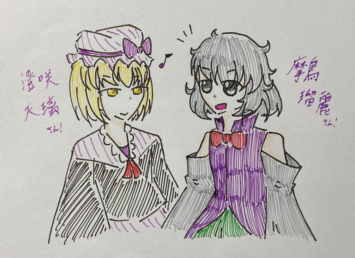 #むしのらくがきろく 本日は魅麻カロネさん(@caroneThe_SOU )の創作っ子、摩鳥 瑠麗さんと澄咲 天璃さんです! シンプルにかわいい。この二人が今後どんな活躍をするのか、陰ながら楽しみにしております…!