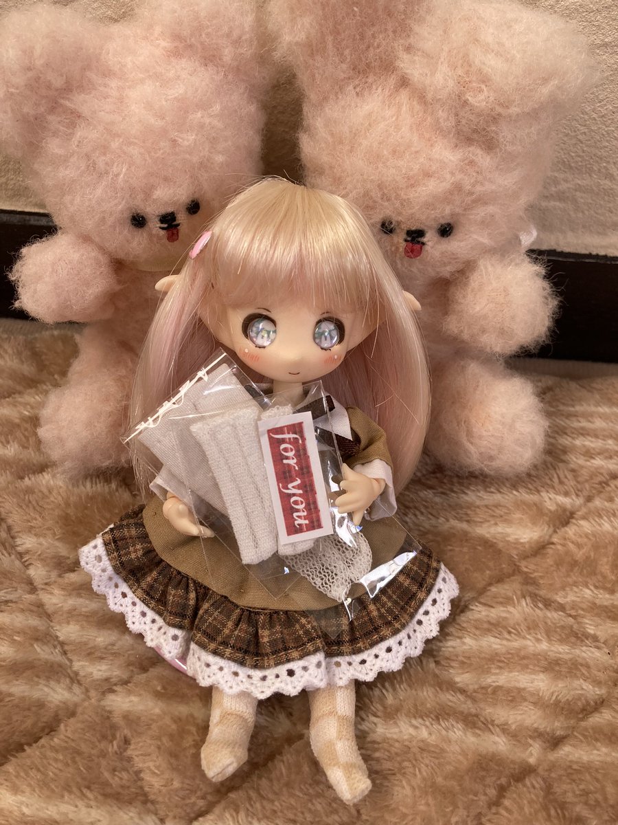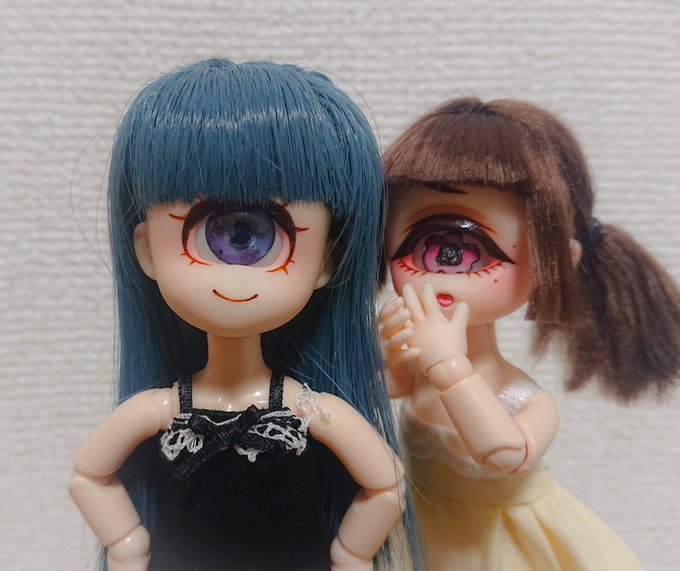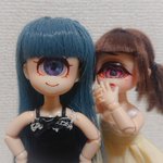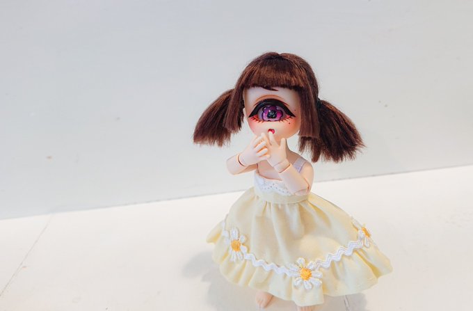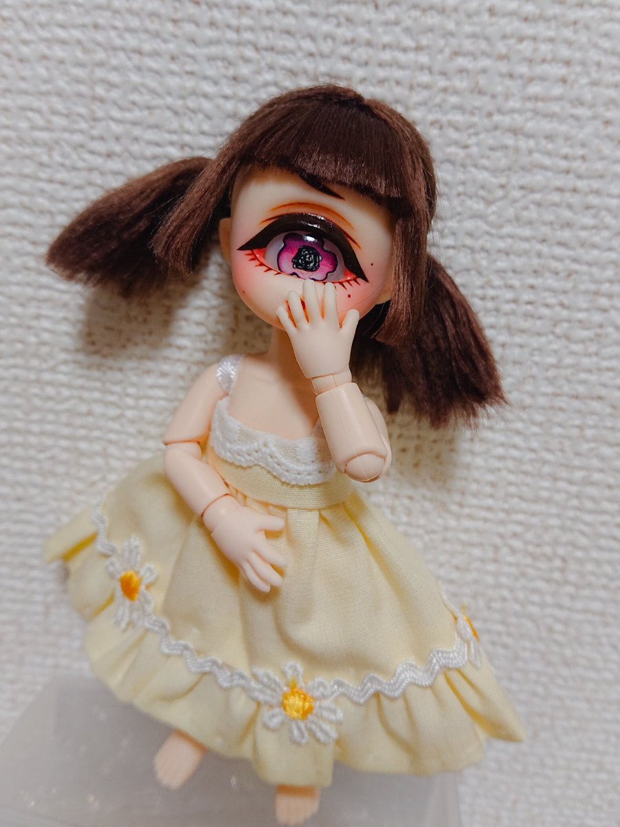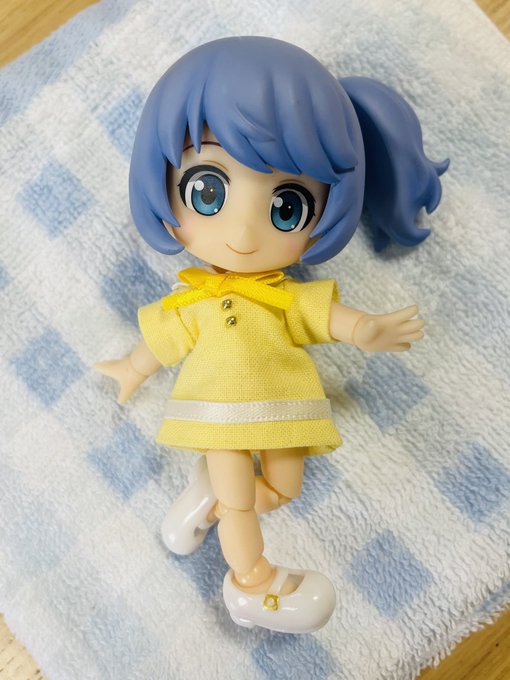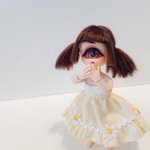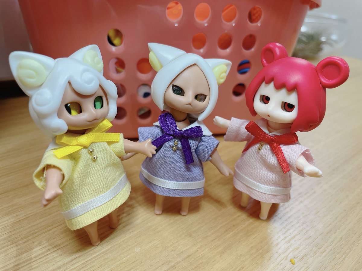 お披露目がすごく遅くなって申し訳ないんだけど、ひよこめいぷる様 のキュポワンピ、イエローとパープルをおかわりして、3人でお揃いできるようになったの見てください!かわいいっしょ #キューポッシュ #もげにゃん #めいぷるしょこらんど
