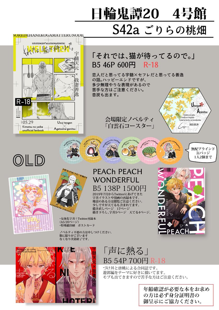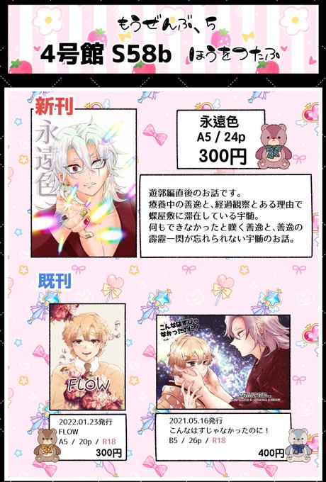【5/29 日輪鬼譚20】宇善プチ もうぜんぶ、5の当日お品書きです。当日合わせの新刊はありませんが、無配置いて待機しております。よろしくお願いします。 4号館T02a 夕暮れもどき #もうぜんぶ5_サークル参加します