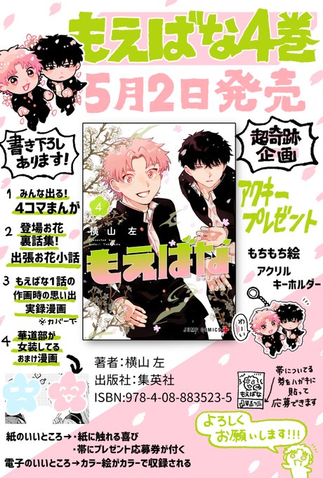 🌸もえばな最終4巻5月2日(火)発売🌸 おまけ楽しく描かせていただきました!アクキー企画もつけていただいてます!(感謝…)気になった方ぜひチェックいただけたら嬉しいです。よろしくお願いします✨ #もえばな Amazon→amazon.co.jp/gp/product/408… ネット書店さま一覧→shueisha.co.jp/books/items/co…