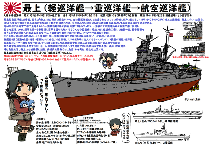 今日、7月28日は 昭和20年(1945年)に呉軍港空襲があった日ですが twitter.com/ginntokii/stat… 巡洋艦「#最上」の就役日でもあります 昭和10年(1935年) 軽巡→重巡→航空巡洋艦 と変貌を遂げ 2019年5月8日にスリガオ海峡の海底で発見されました 現在は、その名を継ぐ護衛艦「#もがみ」が就役しています