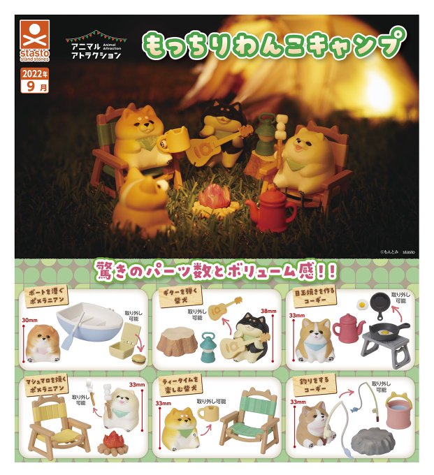 \お知らせ/ 新作カプセルトイ「もっちりわんこキャンプ」が2022年9月に発売されます🥳わんこたちの原型制作を担当しました! 柴犬、ポメラニアン、コーギーとキャンプグッズがセットになっています。 マシュマロを焼いたり、釣りをしたり…集めて遊んでくださいね🐶⛺️🌿 #もっちりわんこキャンプ