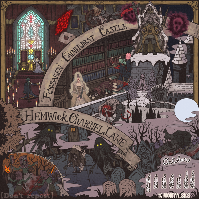 Bloodborne Calendar 2022 OCTOBER 今年のカレンダーはズィーカ兄妹と巡るヤーナムツアー。 10月はヘムウィックの墓地〜カインハースト城へ🏰 今月はゲストがいますよ🌸 #bloodborne #もにゃ絵