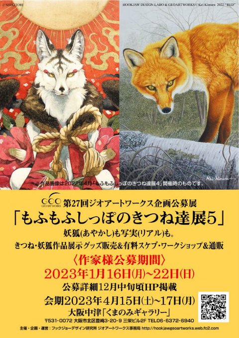 🦊募集要項掲載! 2023年最初の #展覧会 #募集 第27回ジオアートワークス企画公募展 #もふもふしっぽのきつね達展5 大阪中津くまのみギャラリー 🦊2023年1/16-22募集 🦊2023年4/15-17開催 #きつね #妖狐 作家様 ぜひご検討下さい ご質問などはDMまでお気軽に hookjawgeoartworks.web.fc2.com/GEOARTWORKSkou… #キツネ #fox