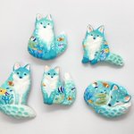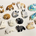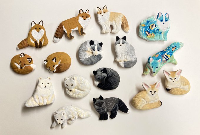 #もふもふしっぽのきつね達展5 ブローチ、いろんなキツネを制作しました アカギツネ(キタキツネ、プラチナ、茶プラチナ、ギンギツネ)とホッキョクギツネとフェネック、そして追加で作ったうみきつね