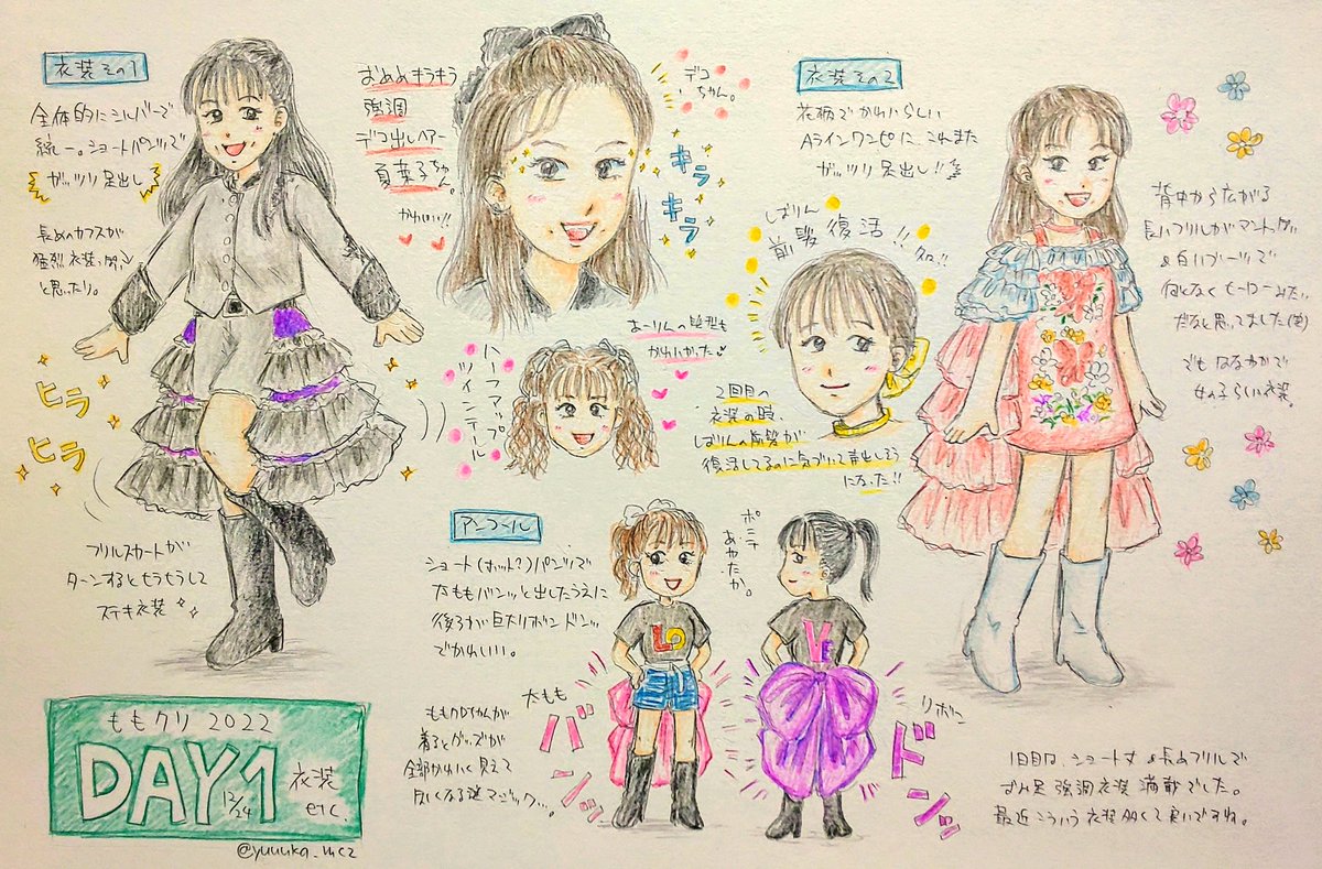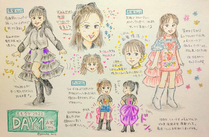 今更ながらのももクリ衣装思い出描きDAY1。 衣装が可愛いのも毎年楽しみなのですが、今年は綺麗なおみ足(太もも✨)出しつつヒラヒラ衣装でターンすると裾が広がる仕様が多く、より一層輝かしくて目の保養になりました…😍 #ももクリ2022 #momoclo_fanart