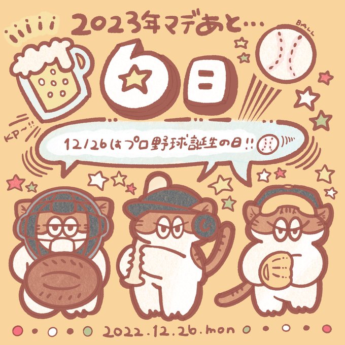 🐈<2023年まであと… . 6日! 今日はプロ野球誕生の日!⚾️ 1つのボールを打って投げて捕って走って…猫が野球やったらボールにじゃれて試合どころじゃなくなりそう🤔 #あにまるいらすと #もよのイラスト #アニマルイラスト #動物イラスト #絵描きさんと繋がりたい #猫好きさんと繋がりたい #1日1絵