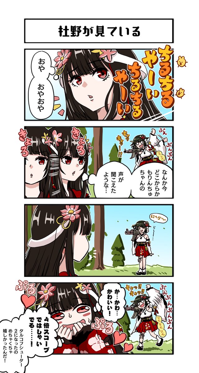 #ちるっとあーと #もりのこれくしょん こんばんは!夕刊の4コマ描きました!4倍スコープではしゃぐ杜野はとてもかわいい。そして個人的に一枚目のちるさんがとても良き表情で描けた。姉妹説推してます。
