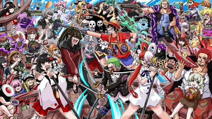#もりのこれくしょん #イラスト 完成したー!!「ONE PIECE FILM RED」がアマプラに来た記念!ついにもりんちゅウォチパってことで作りました!麦わらの一味VSツイッチ配信者って感じ!大変だった! 酒場のブルーノは唯一僕がモノマネできるキャラなので入れてます。まだ見てません。楽しみだー!